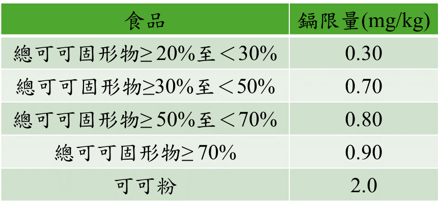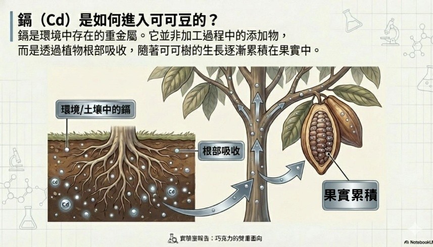 鎘 (Cadmium, Cd) 為自然界中的元素,存在於地殼之中。所有的土壤和岩石,包括煤和礦物肥料,都含有一定量的鎘。所有的植物都有一定程度吸收鎘,但可可樹(Theobroma cacao L.)比其他植物更有吸附累積鎘的能力(Vanderschueren et al., 2021)。同學皺眉問說:「那吃到有鎘的可可會怎樣嗎?」,小安老師說:「重點在『長期』。」鎘的風險多半來自長期、慢慢累積的暴露。會累積於腎臟並可能導致腎臟疾病的產生。其他的長期影響,則是肺的損傷和骨骼脆弱,骨質疏鬆的症狀(痛痛病)。國際癌症研究機構(IARC)已將鎘及其化合物列為對人類明確致癌(Carcinogenic to humans, Group 1),因此各國會訂定食品中的鎘限量。巧克力與可可粉往往是監測重點,臺灣自2026年1月1日起針對巧克力及可可粉提出重金屬鎘之限量規定,凡於市面流通販售之巧克力及可可粉,均應符合鎘之限量標準。