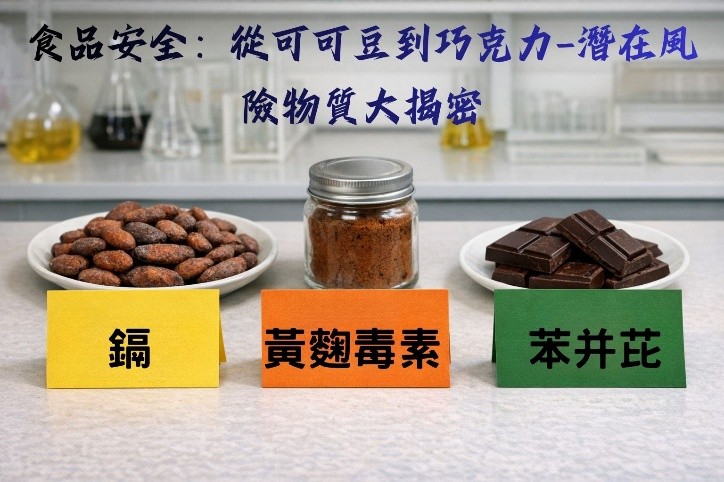 同學一邊吃著巧克力脆片,一邊說:「老師,巧克力不是甜甜幸福滋味嗎?會有什麼潛在風險物質啊?」小安老師笑了笑說:「來來來~請大家帶跟我走。」實驗室旁展示區,桌上擺著三樣東西,分別是一盤可可豆、一小罐可可粉以及黑巧克力片。旁邊放著三張卡片,上面分別寫著:鎘(Cadmium, Cd)、黃麴毒素(Aflatoxin, AF)、苯并芘(Benzo[a]pyrene, BaP)。