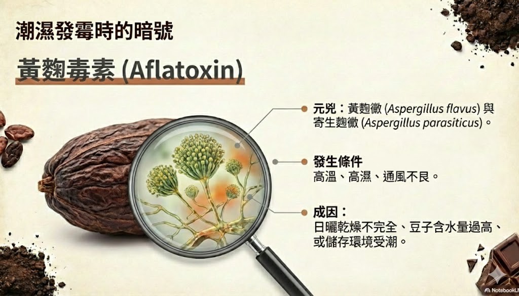 黃麴毒素主要由黃麴黴(Aspergillus flavus)與寄生麴黴(Aspergillus parasiticus)等黴菌在特定環境下生成(高溫、潮濕、通風差等)。如果可可豆日曬或乾燥不完全、含水量太高,或儲存環境潮濕,黴菌就可能趁虛而入。黃麴毒素常見型別包含 AFB1、AFB2、AFG1、AFG2,其中以AFB1(黃麴毒素B1)毒性最強、最具致癌性。黃麴毒素的毒性作用主要是AFB1在體內代謝形成反應性中間產物毒素,毒素與基因核酸DNA結合,抑制了DNA及RNA的合成,結果造成核仁形態改變,同時抑制了蛋白質的合成。黃麴毒素最主要的毒性靶器官是肝臟。國際癌症研究機構 (IARC)已將黃麴毒素列為對人類明確致癌(Carcinogenic to humans, Group 1)。